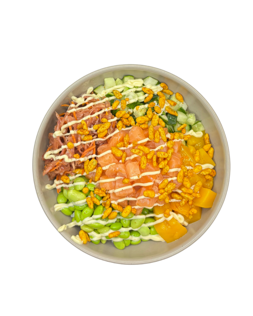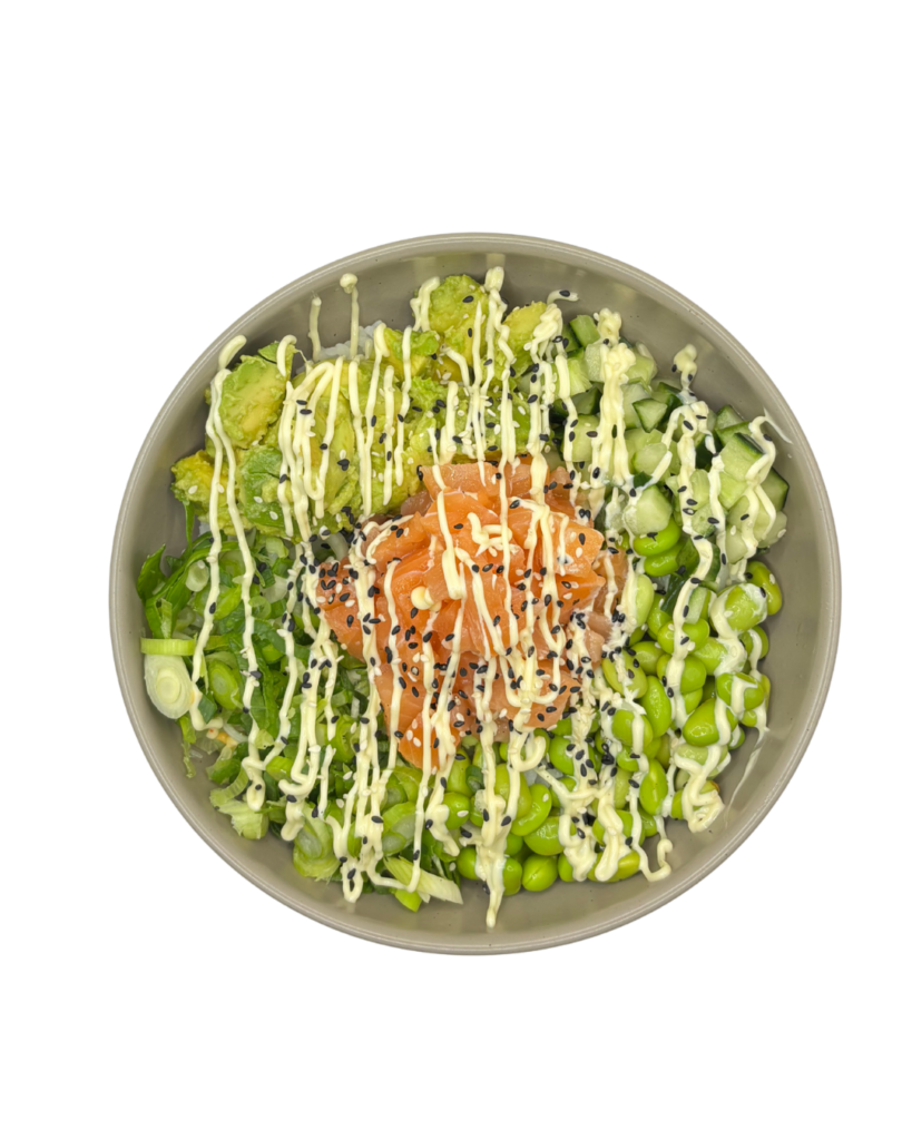 Sushi Reis, Sesam Dressing, Lachs, Edamame, Gurke, Avocado, Frühlingszwiebel, Creamy Mayo, Mixed Sesam