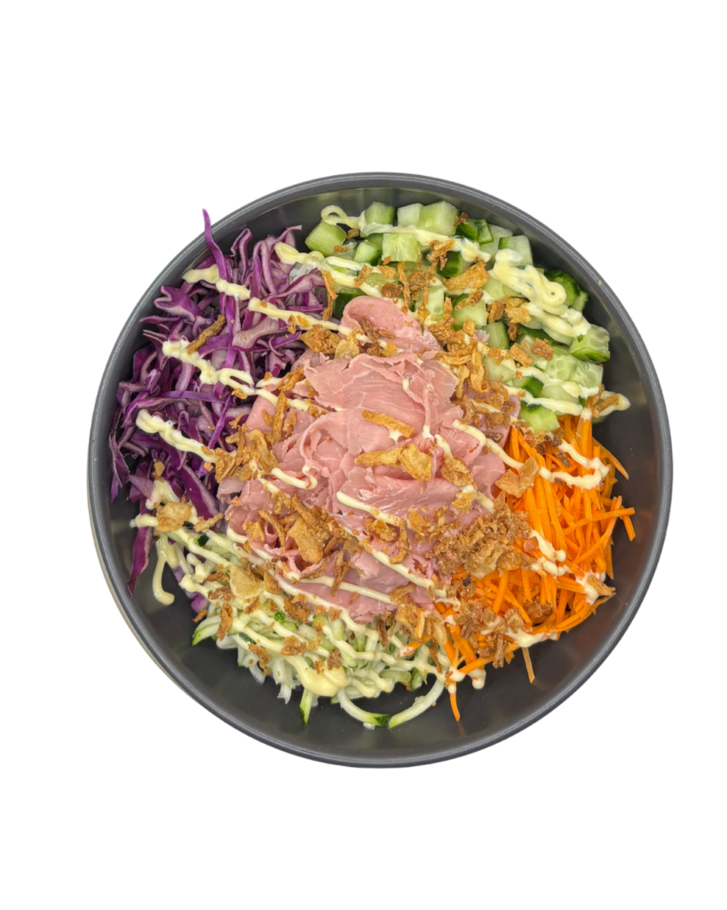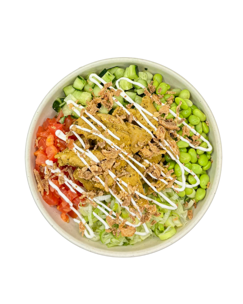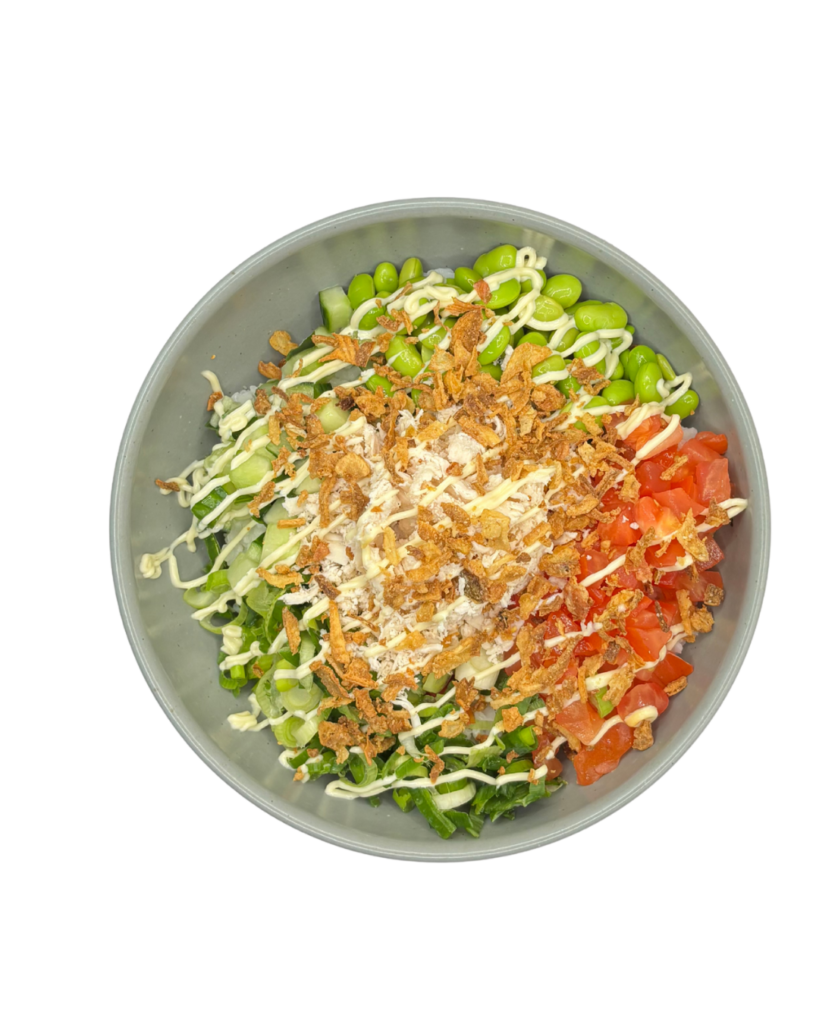 Sushi Reis, Teriyaki Dressing, Sous-vide Chicken, Edamame, Gurke, Tomate, Frühlingszwiebel, Cream Mayo, Röstzwiebel