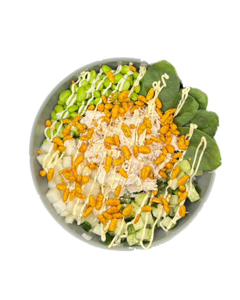 Sushi Reis, Spicy Korean Dressing, Sous vide Chicken, Edamame, Gurke, Baby Spinat, Kohlrabi, Creamy Mayo, Crunchy Sunflower