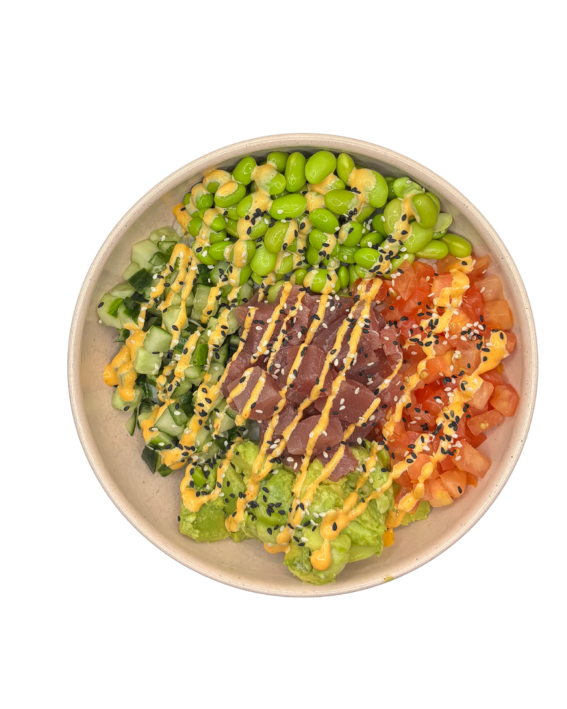 Sushi Reis, Spicy Ponzu Dressing, Tuna, Edamame, Gurke, Tomate, Avocado, Spicy Mayo, Mixed Sesam